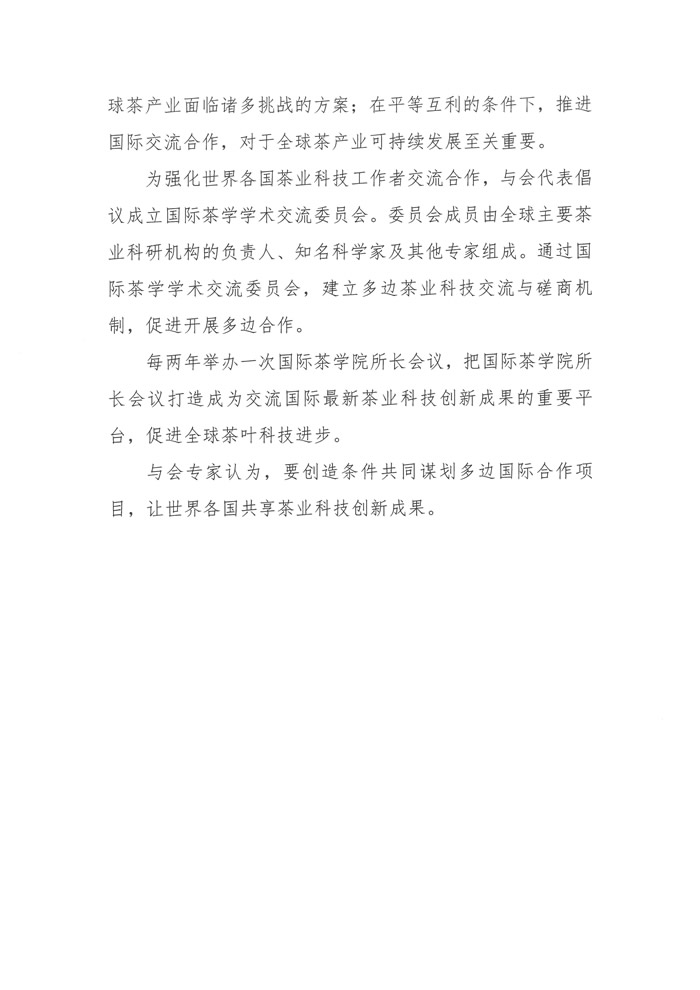 來自13個國家的茶葉研究所所長達成共識,形成并發(fā)布了《杭州宣言》。各國茶葉科技工作者要加強對茶葉的健康功能研究和宣傳,不斷擴大茶葉消費,進一步增強茶葉市場競爭力。同時,要進一步加強交流合作,建立多邊茶業(yè)科技交流與磋商機制,共同謀劃國際合作項目,提出解決當前全球茶產(chǎn)業(yè)面臨諸多挑戰(zhàn)的方案。商定今后每兩年舉辦一次國際茶學院所長會議,把國際茶學院所長會議打造成為交流國際最新茶業(yè)科技創(chuàng)新成果的重要平臺,促進全球茶葉科技進步。