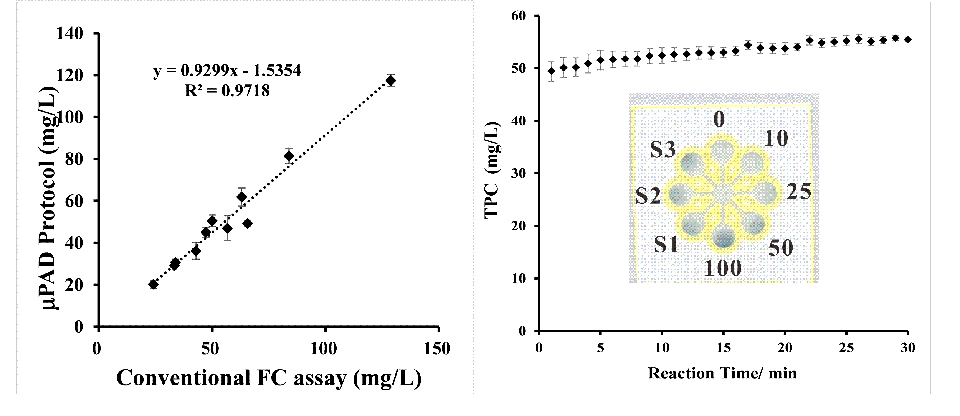 茶多酚含量快速檢測效果。左:本方法與傳統檢測方法數據結果吻合良好;右:新方法可在任意時間進行檢測(檢測時間對結果無明顯影響)。