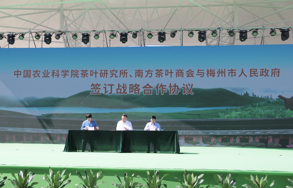11月1日,在第三屆廣東茶葉產業大會開幕式上,我所與梅州市人民政府簽署促進梅州茶產業發展戰略合作協議,副所長魯成銀和梅州市副市長溫向芳分別代表雙方簽字。廣東省政府副秘書長鄭偉儀,廣東省農業農村廳廳長顧幸偉、副廳長馮彤,梅州市委書記陳敏、市長張愛軍,陳宗懋院士、劉仲華院士等領導和專家出席。