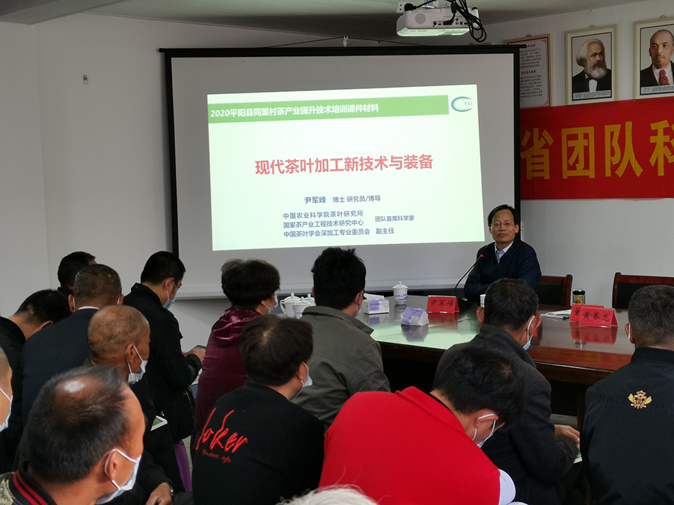 團隊一行實地指導茶園建設和管理技術,并為同盟村50多名茶農講授適用茶樹品種與生態(tài)栽培技術、現(xiàn)代茶葉加工新技術和設備、黃湯加工技術,還贈送了《名優(yōu)綠茶機械化采制技術與裝備》一書,鼓勵茶農科學種茶制茶,促進周邊茶農和低收入農戶增收致富。