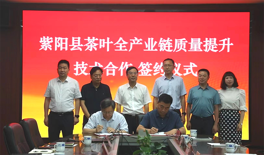 6月10日,中國農業科學院鄉村振興示范縣——紫陽縣縣長向德剛,副縣長陳德鈞、蔡英宏一行來所調研考察。所長姜仁華,黨委書記江用文,副所長王新超,紫陽縣科技特派團茶產業組組長楊亞軍研究員參加接待并座談。江用文書記代表我所與紫陽縣簽訂了“紫陽茶葉全產業鏈質量提升”戰略合作協議。