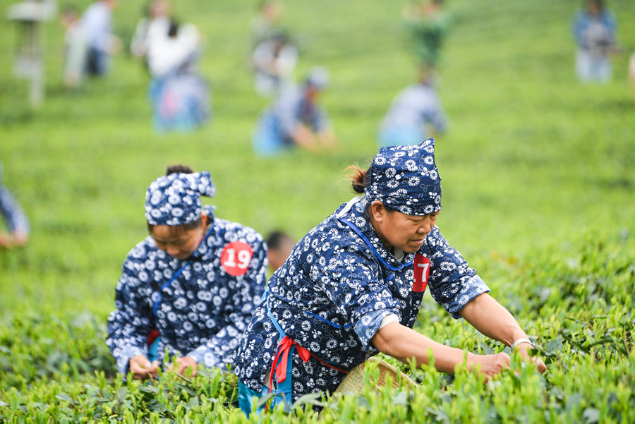 4月2日,第二屆“永川秀芽杯”川渝合作瀘永江產業帶采茶大賽上,選手在重慶市永川區永榮鎮白云寺村鄉村振興就業園茶葉采摘區采茶。新華社記者王全超 攝