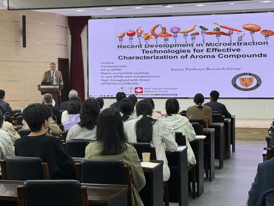 Janusz Pawliszyn教授作了題為“微萃取技術在香氣化合物有效表征方面的最新進展”的學術報告,介紹了固相微萃取(SPME)技術在風味與香氣化合物研究方面的獨特優(yōu)勢,指出了該技術在處理復雜基質(zhì)或親水化合物時面臨的挑戰(zhàn),并介紹了薄膜固相微萃取(TF-SPME)及TF-SPME與傳統(tǒng)SPME纖維的自動化集成技術等創(chuàng)新方法,可提高極性化合物的提取效率,為我所科研人員在香氣化合物表征領域的研究提供了新的思路和方法。