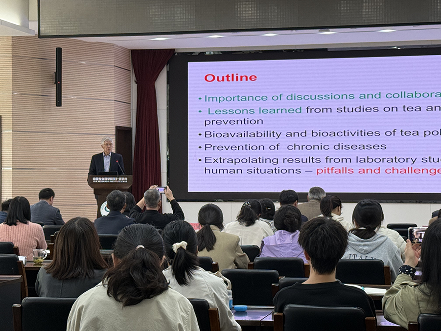 楊中樞教授作了題為“茶葉對健康影響的研究”的學術報告,分享了從茶葉與癌癥預防研究中汲取的經(jīng)驗教訓,指出茶葉中的多酚類物質(zhì)具有優(yōu)異的抗氧化活性,對預防慢性疾病具有重要意義。楊教授提到,將實驗室研究結果應用到人類實際情況時面臨著諸多挑戰(zhàn),如個體差異、環(huán)境因素等。楊教授還強調(diào)了討論與合作的重要性,建議青年科技工作者跨學科、跨國界的開展合作與交流。